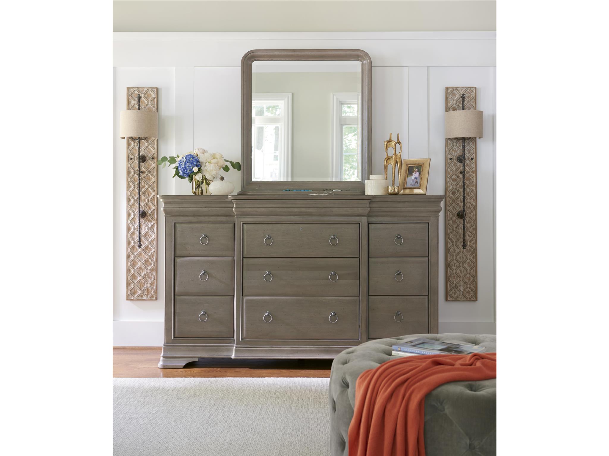 12 drawers jewelry tray in hidden drawers top left drawer front flips down for electronics cedar bottom in bottom drawer Driftwood finish FINISH Driftwood SIZE 70W X 21D X 42H