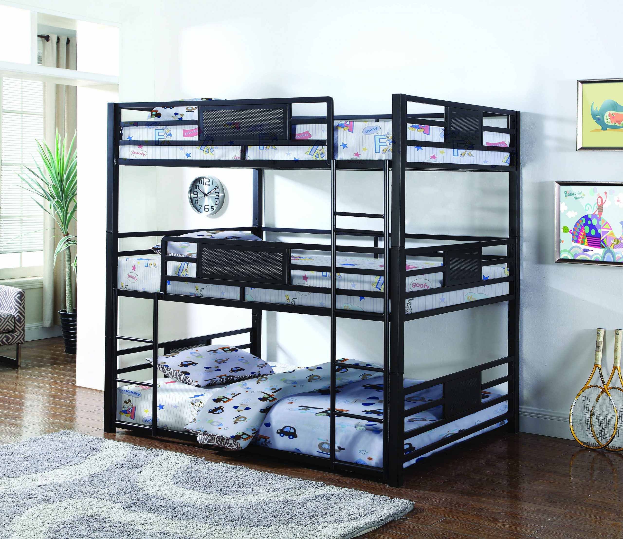 - Heavy duty metal triple bunk bed finished in dark bronze