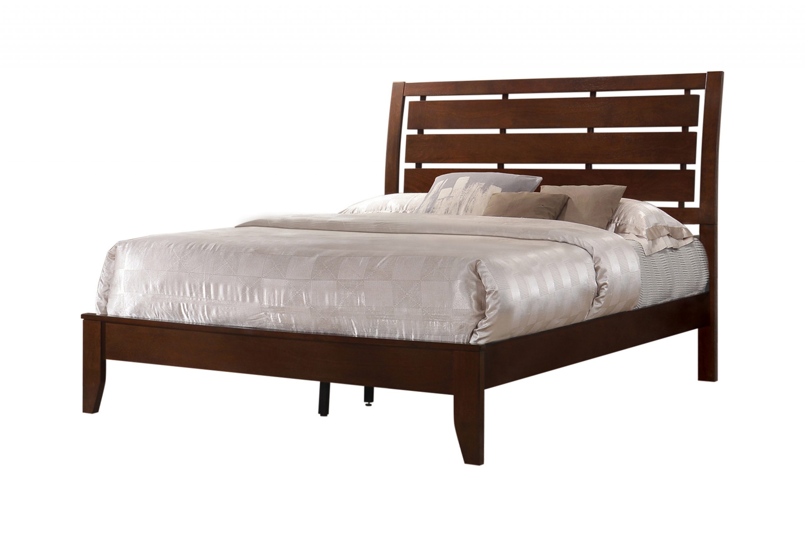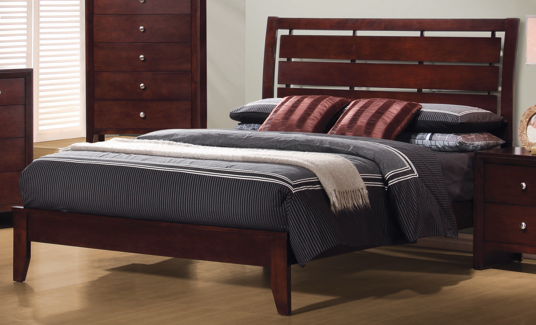 The Serenity collection presents this full bed that’s perfect for teenage or guest bedroom. Bed is highlighted by a light, airy headboard that’s styled with horizontal slats. Footboard is low profile and clean, allowing prominent display of the tapered legs for an individualist pose. Bed is finished in a rich merlot that conveys warm ambiance. This bed is also offered in king, queen, and twin.