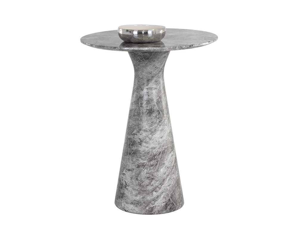 An alluring round bar table that features a well-defined tapered base. Crafted from concrete with a grey faux marble finish. Suitable for indoor and outdoor covered spaces.