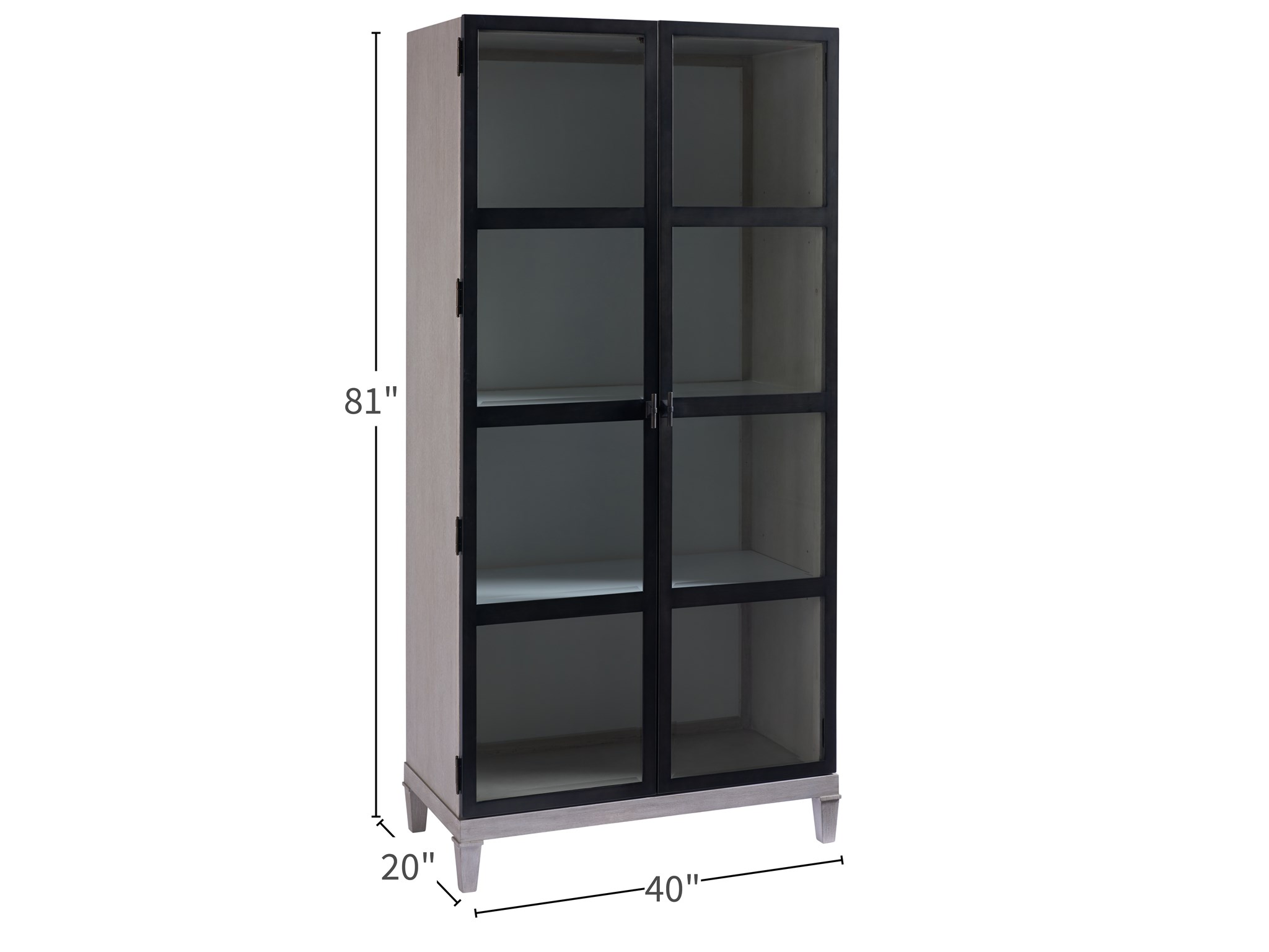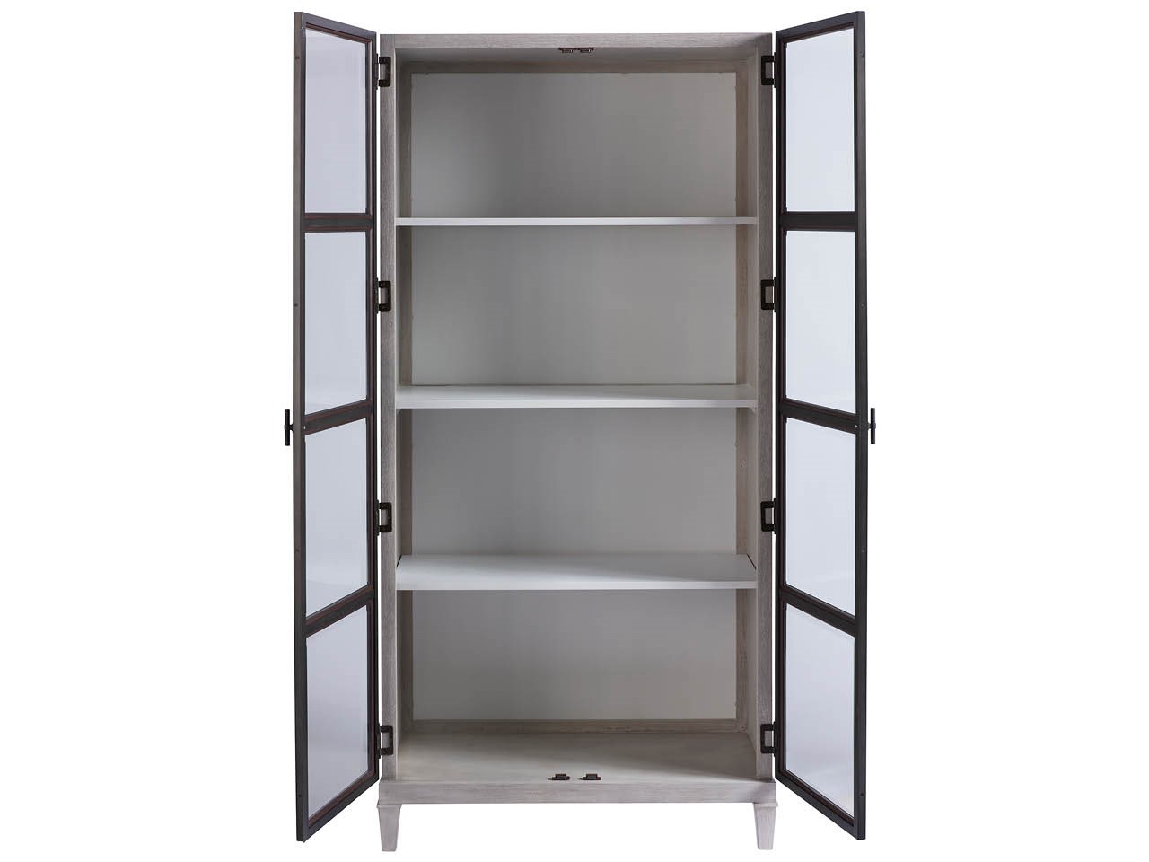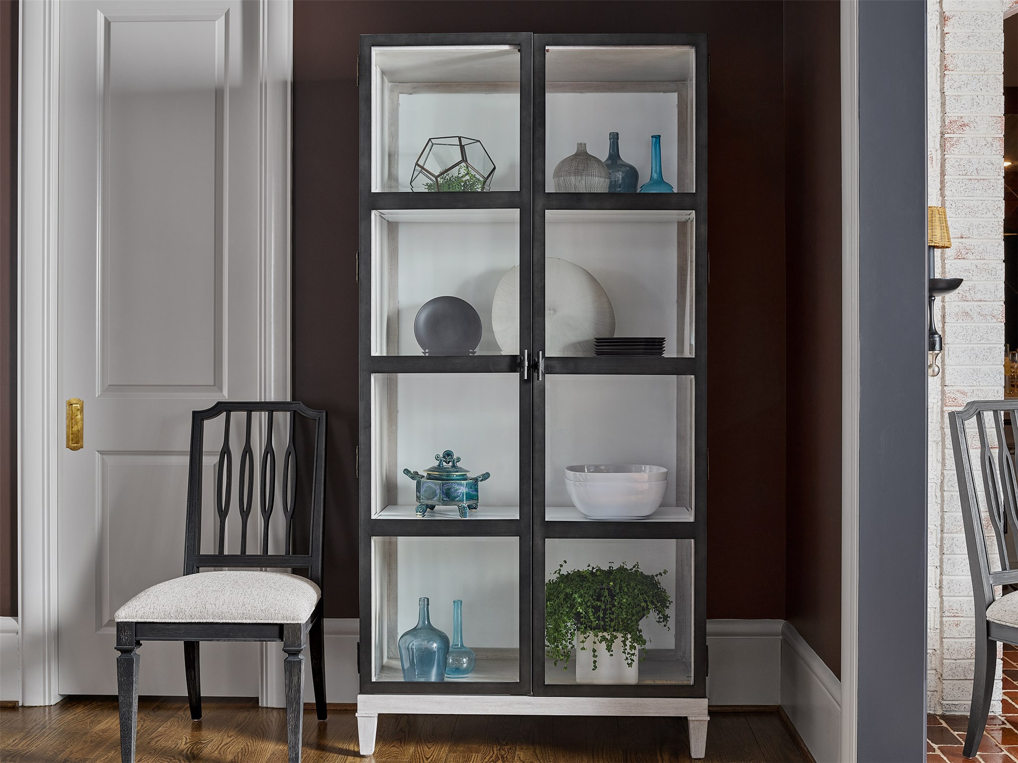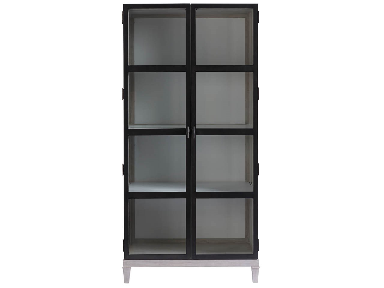The Simon Display Cabinet is distinct in design and generous in function, featuring 4 shelves, interior lighting, and a touch dimmer, encased within gorgeously metal framed doors and beveled glass.