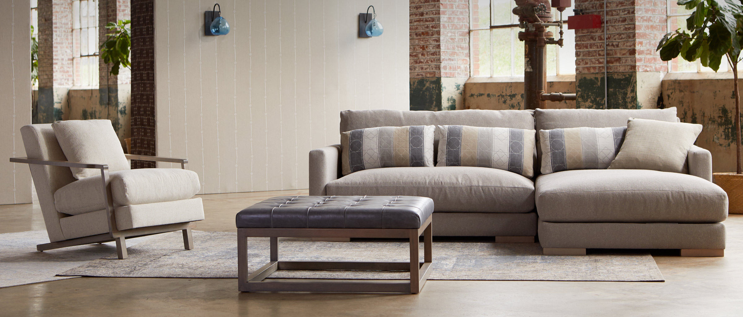 Big, block feet and wide-open bench-style seat cushions create European look and a totally relaxed appeal that makes you just want to, well, chill. And, if you really must have a sofa with arms, you can configure the corner chairs with an armless chair or two – or even the sofa – to create a sublime sectional.