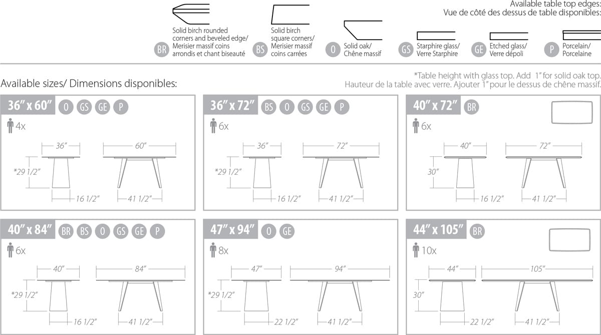 - Solid birch (1 3/4” thick with square corners and 1 5/8” thick with rounded corners and beveled edge).
