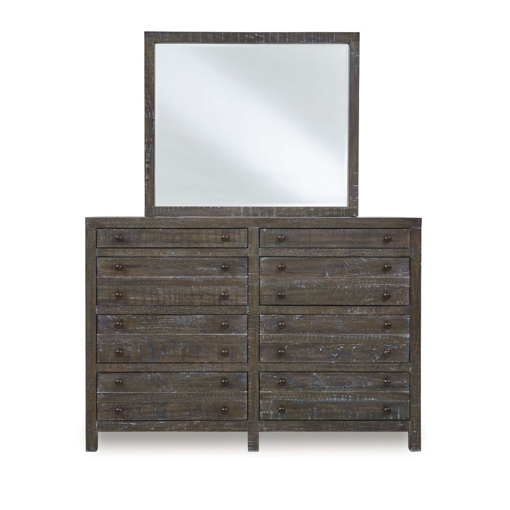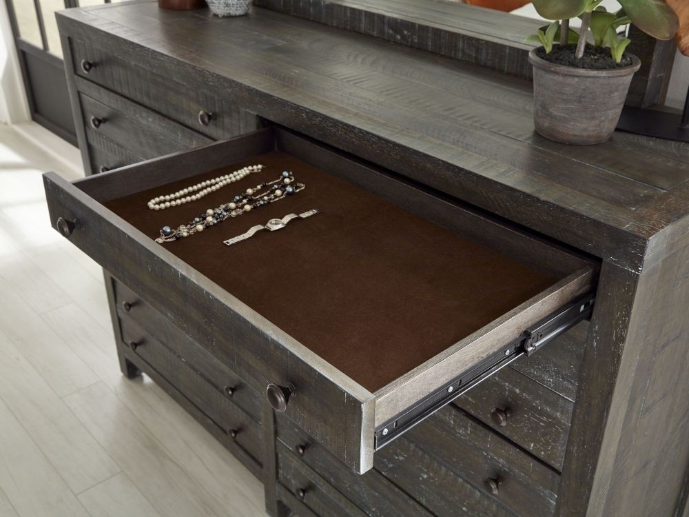 The rough and tumble Townsend collection is crafted from solid hardwood, featuring naturally rough-hewn planks with heavy saw marks, pitting and wane. A 9-step finish uses glaze to highlight wood grain and a light wash to simulate the patina of age. Shallow top drawers are perfect for storing delicate items with the map drawer effect repeated with faux parting rails on large lower drawers.