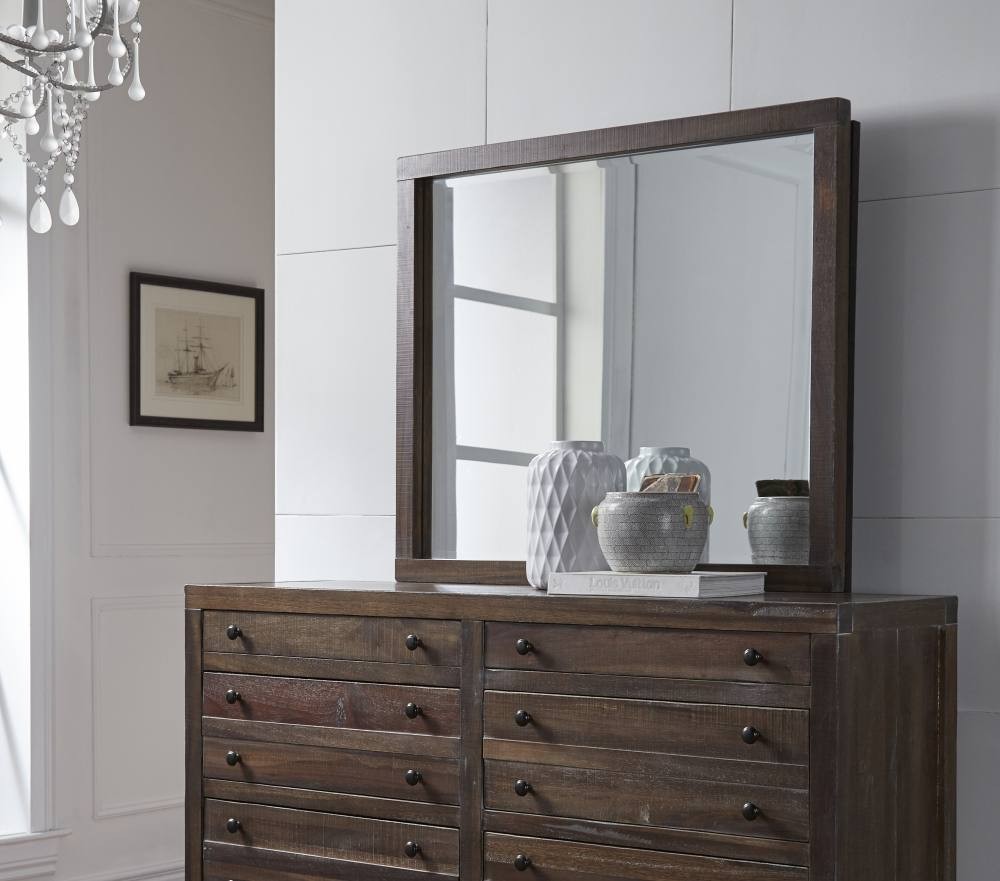 The rough and tumble Townsend collection is crafted from solid hardwood, featuring naturally roughhewn planks with heavy saw marks, pitting and wane. A 9-step finish uses glaze to highlight wood grain and a light wash to simulate the patina of age. Shallow top drawers are perfect for storing delicate items with the map drawer effect repeated with faux parting rails on large lower drawers.