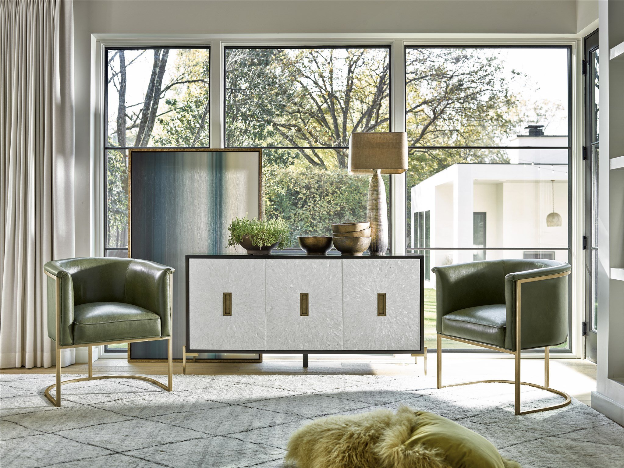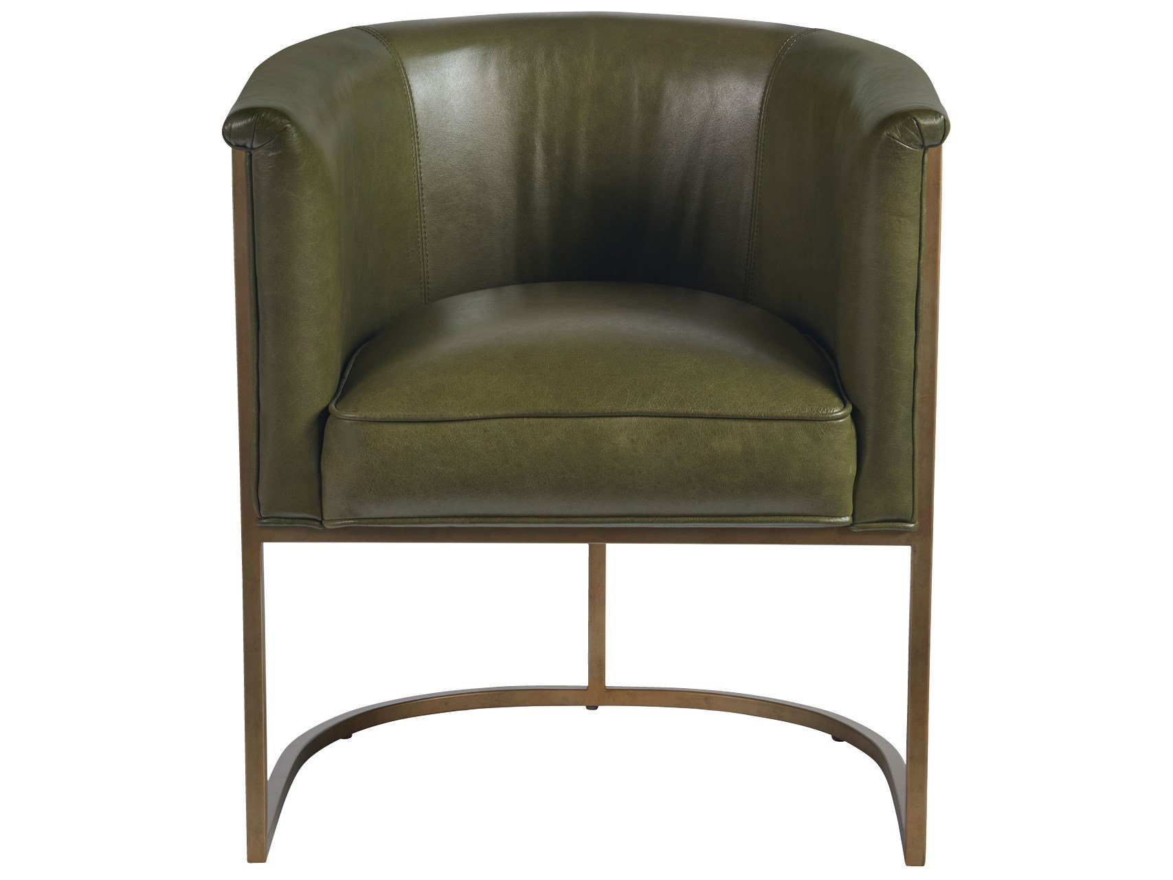 A casual interpretation of a mid-century silhouette, the Wells Accent Chair is a spirited stand-out piece with leather upholstery and a touch of brass.